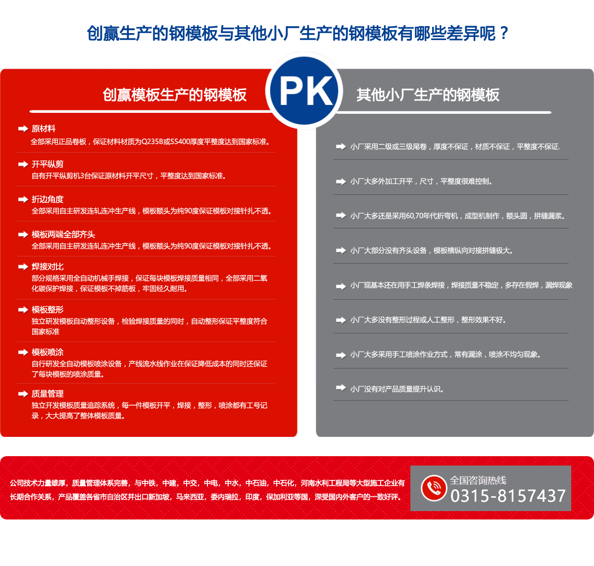 唐山創贏模板有限公司(原唐山豐南雙贏金屬結構廠)始建于一九九七年,是具規(guī)模實力的組合模板生產企業,公司自行設計制造的十二條上卷,連軋,連沖,整形,機械人焊接,調直,噴漆,打包鋼模板生產,實現了自動化一條龍生產,品質優(yōu),效率高,規(guī)格型號為:寬度100-1200mm, 長度300-3000mm, 板厚1.8-4.0mm。